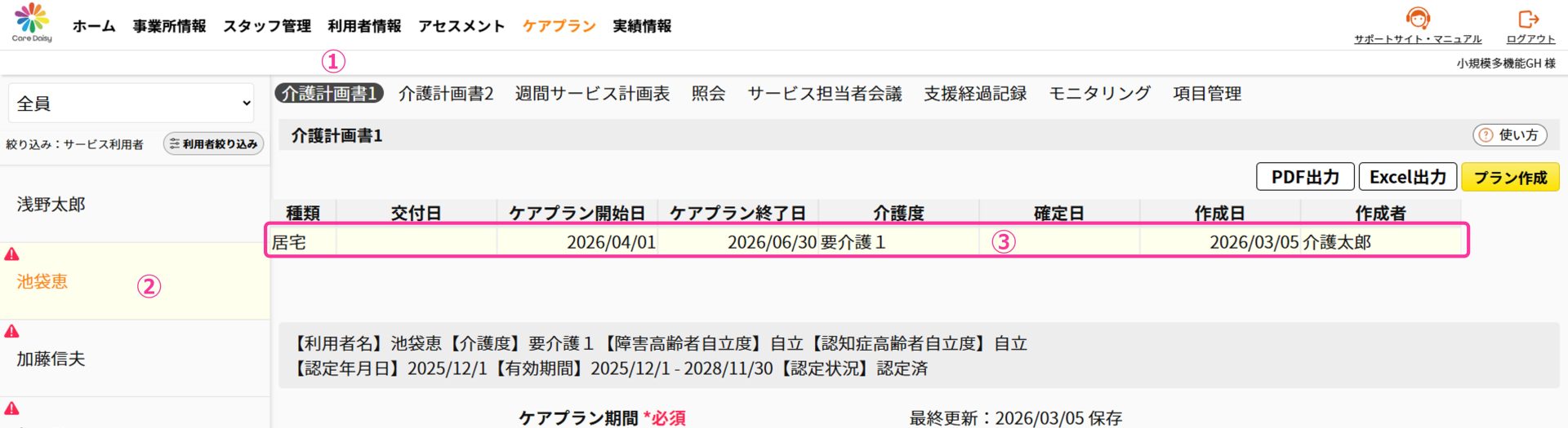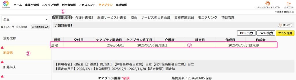 ①ヘッダーメニューの「ケアプラン」をクリックして介護計画書1画面を開きます。