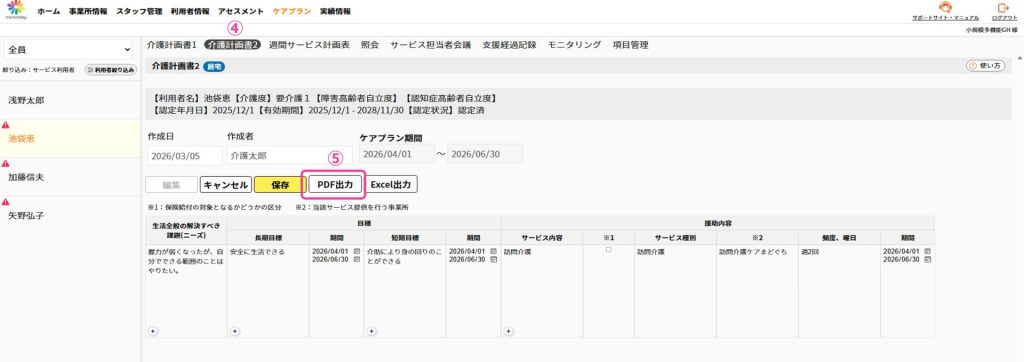 ④「介護計画書2」をクリックします。