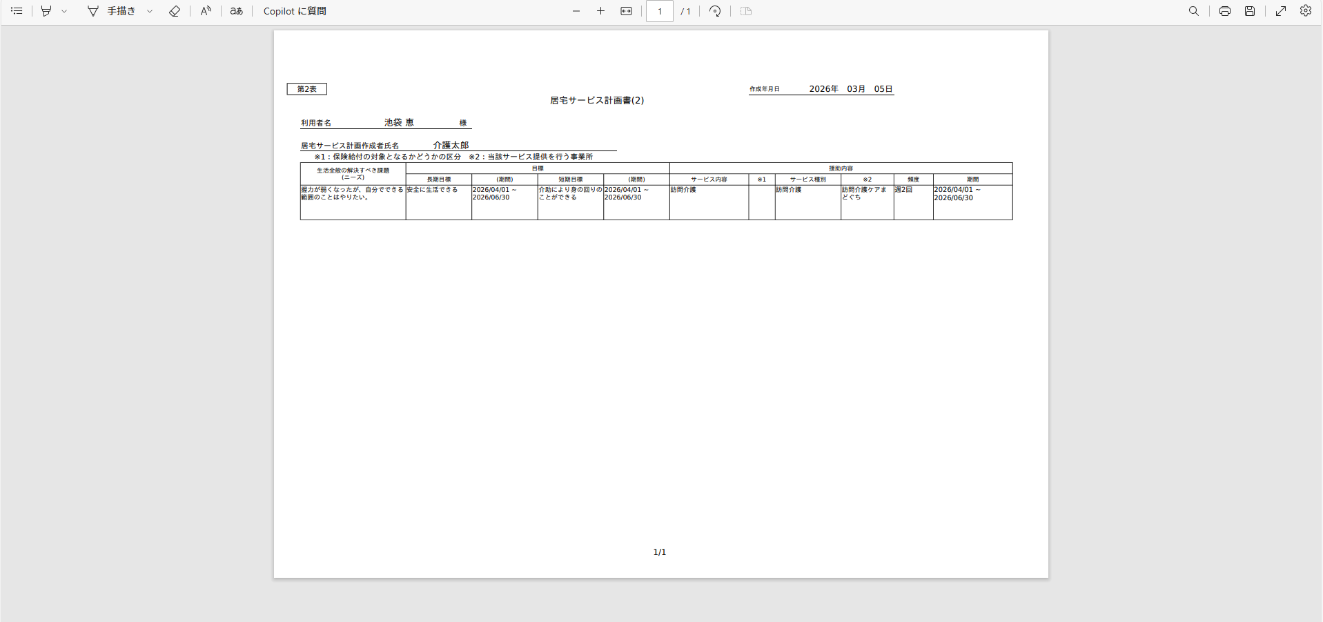 期間はケアプラン期間が自動入力されています。適宜変更してください。