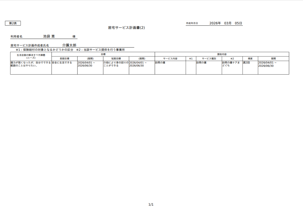 ④「介護計画書2」画面を開きます。このとき、介護計画書1で入力した作成日、作成者、ケアプラン期間が表示されます。