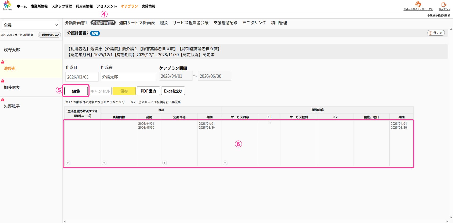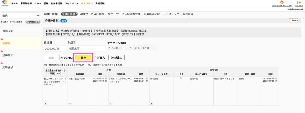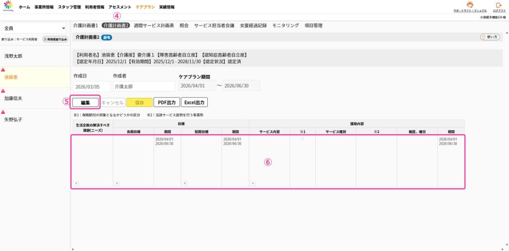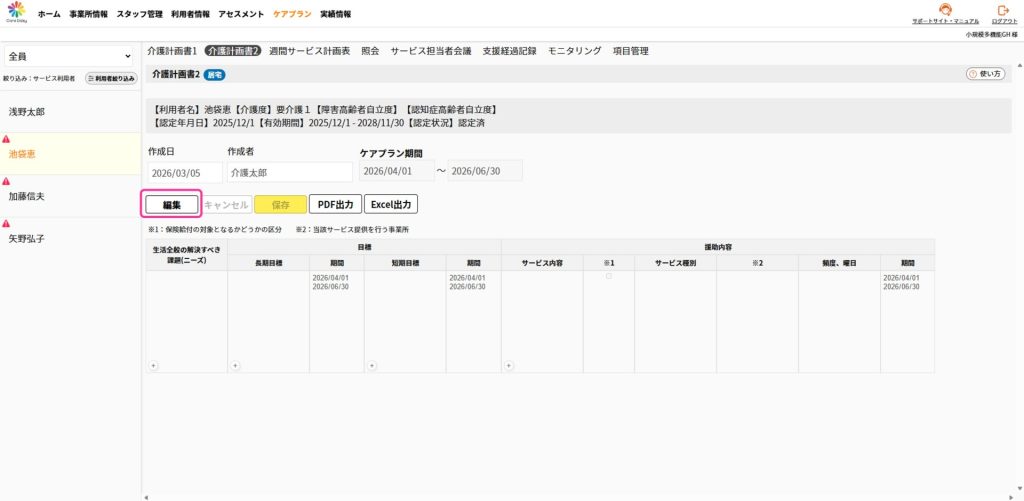 編集するケアプランを選択し、[編集]をクリックすると入力できる状態になります。