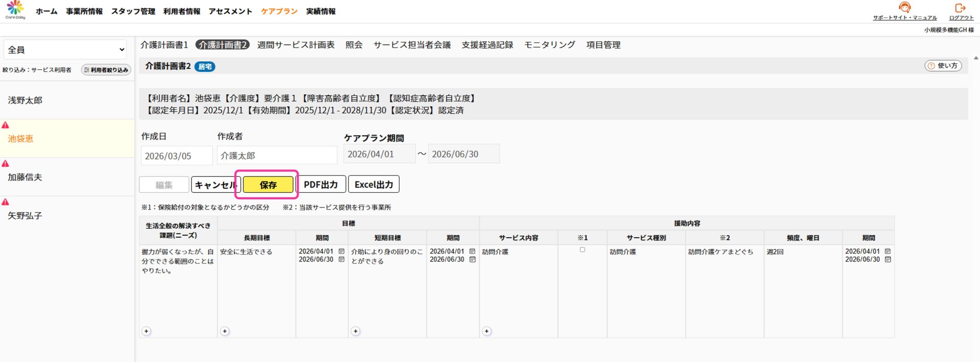 介護計画書1で選択した「居宅/施設」が画面タイトルの横に表示されます。