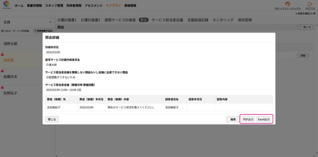 帳票は詳細画面の[PDF出力][Excel出力]から出力、ダウンロードできます。