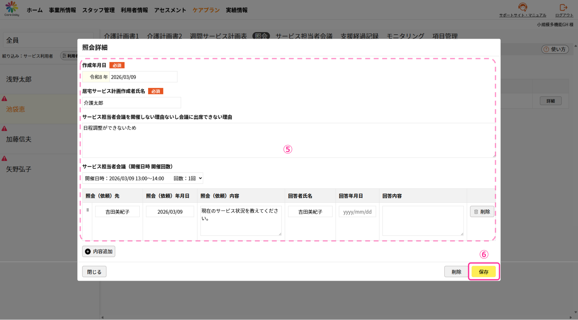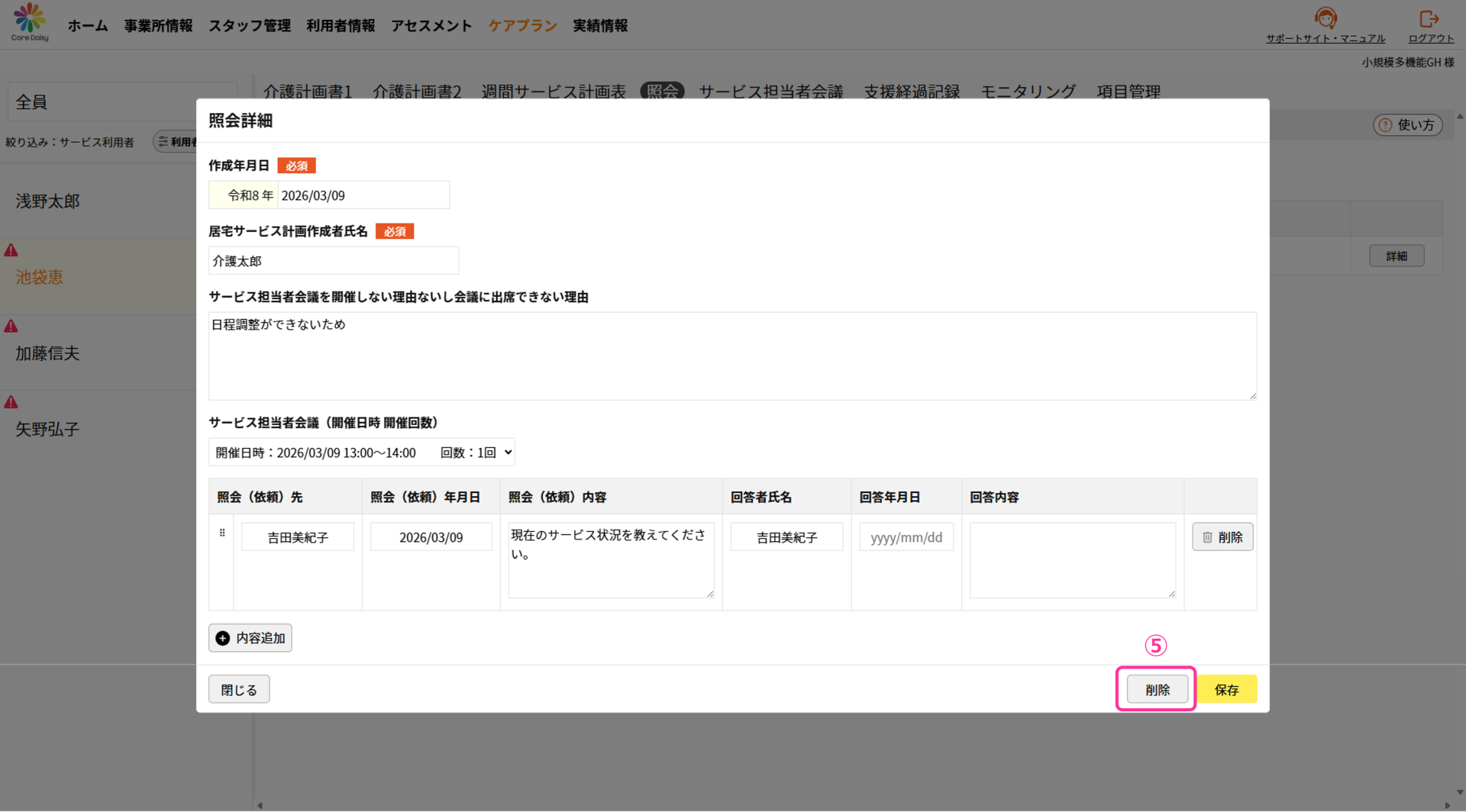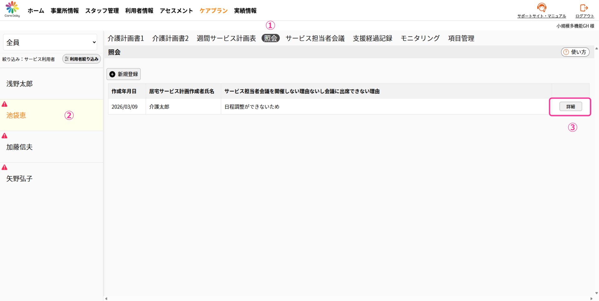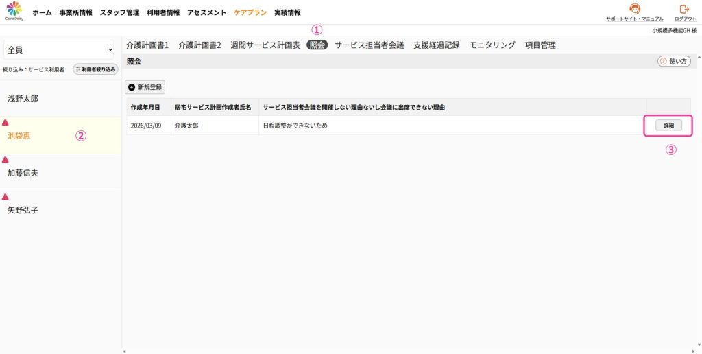 ①「ケアプラン」>「 サービス担当者会議」をクリックして サービス担当者会議の画面を開きます。
