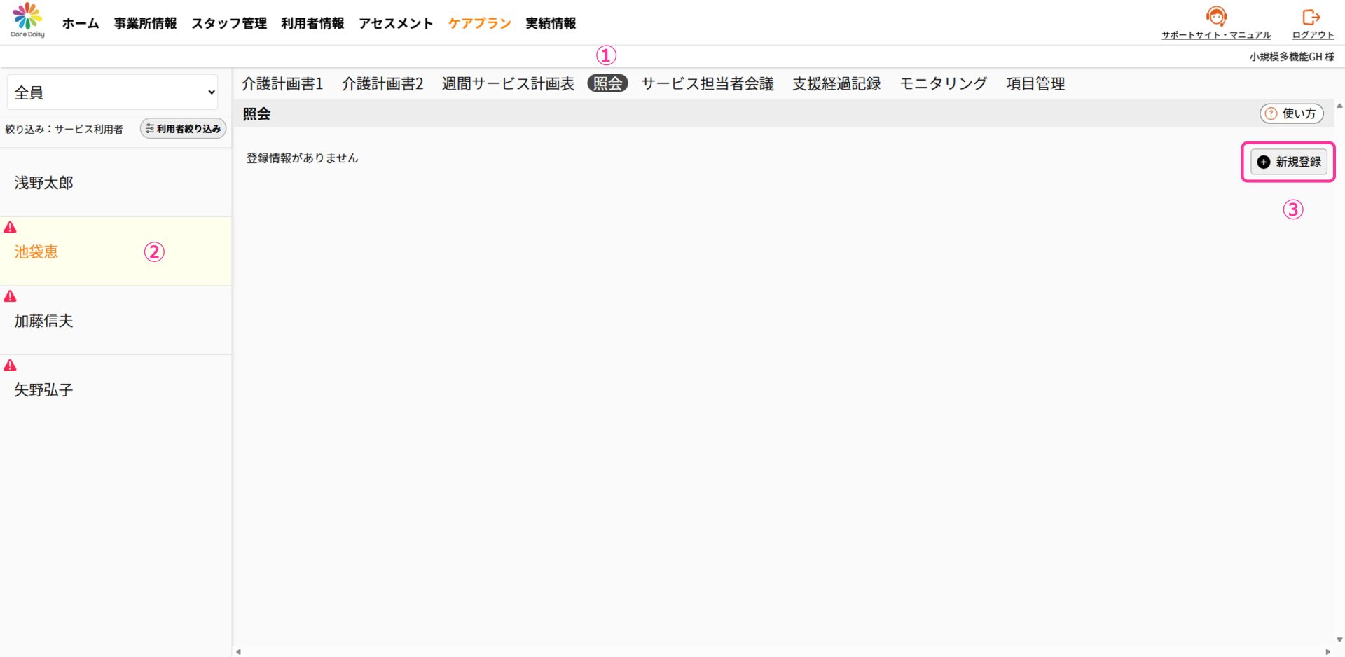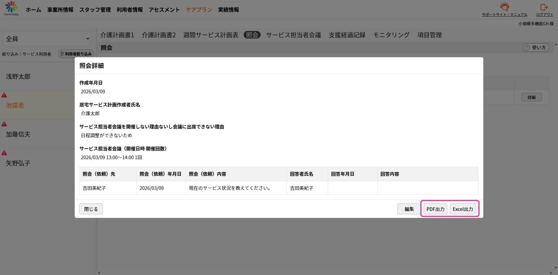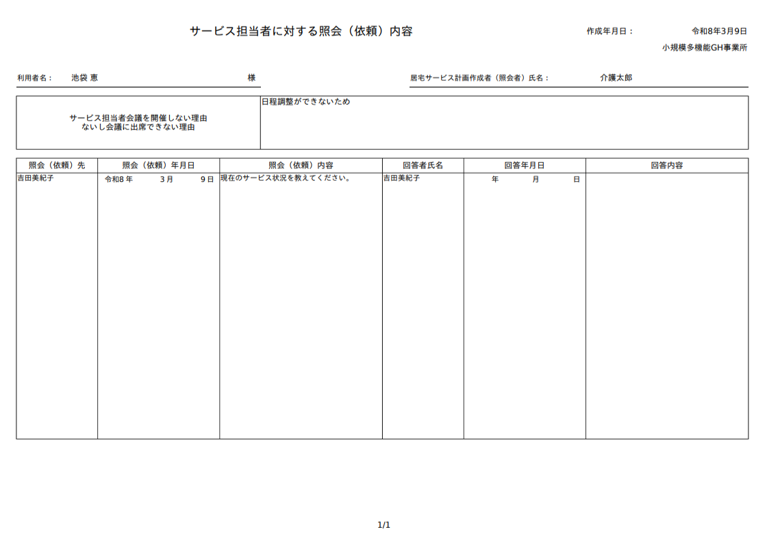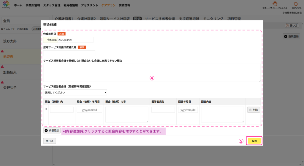 ①「ケアプラン」>「 サービス担当者会議」をクリックして サービス担当者会議の画面を開きます。