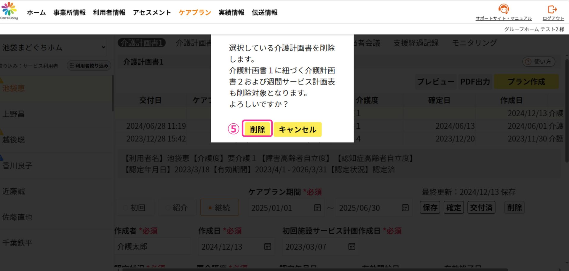 • 介護計画書1の画面でケアプランを削除すると、紐付く介護計画書2、週間サービス計画表も同時に削除します。