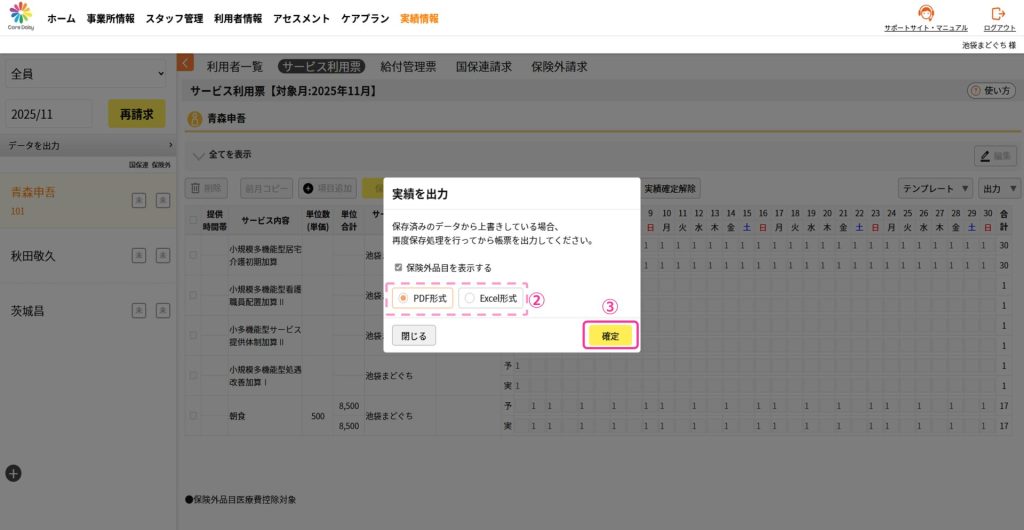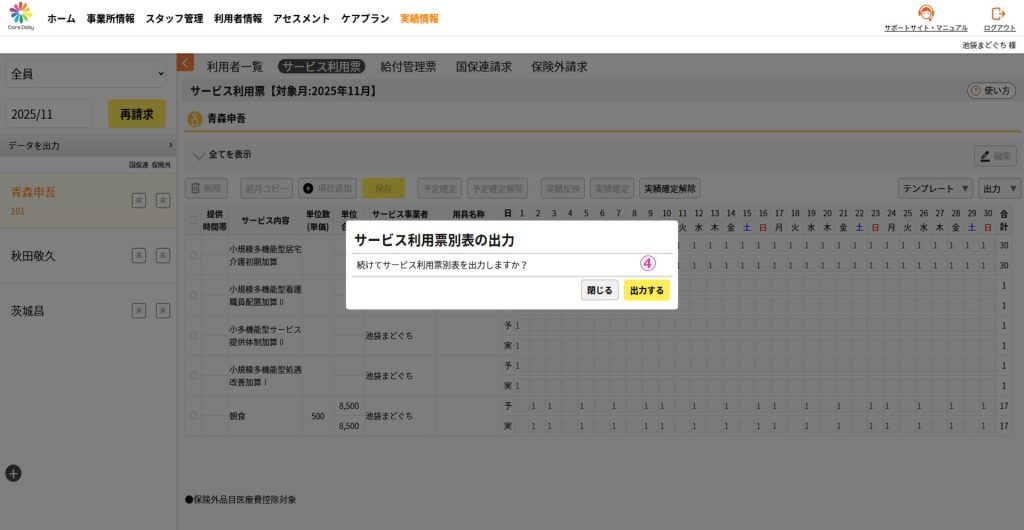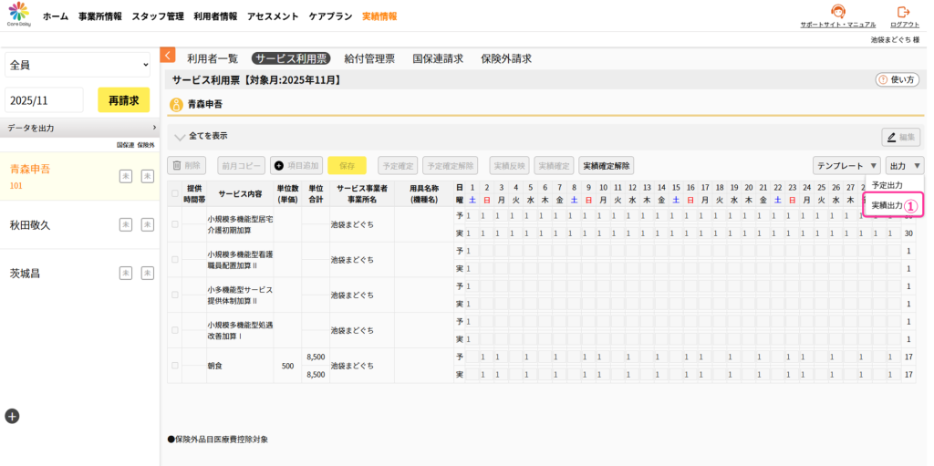 ①サービス利用票を出力したい利用者を選択した状態で、[出力]>[実績出力]をクリックします。