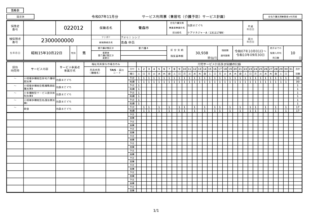 ⑥サービス利用票別表が別画面で表示されます。必要に応じて、保存、印刷してください。