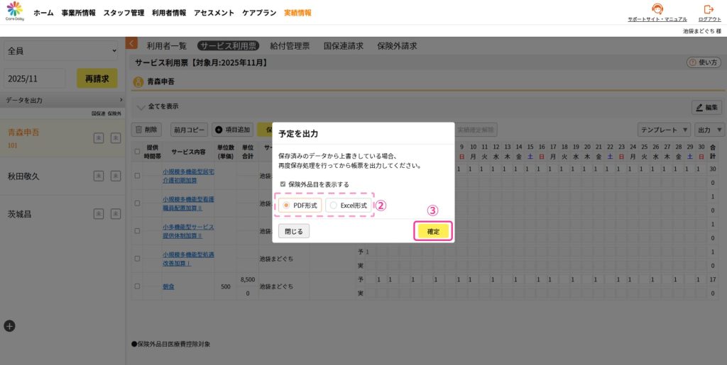 ①サービス利用票を出力したい利用者を選択した状態で、[出力]>[予定出力]をクリックします。