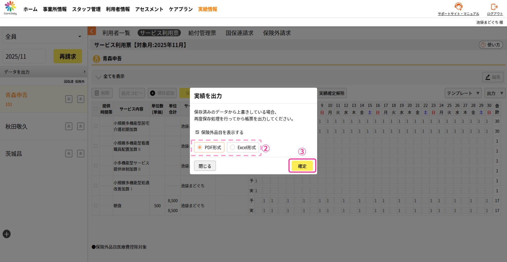 ①サービス利用票を出力したい利用者を選択した状態で、[出力]>[実績出力]をクリックします。