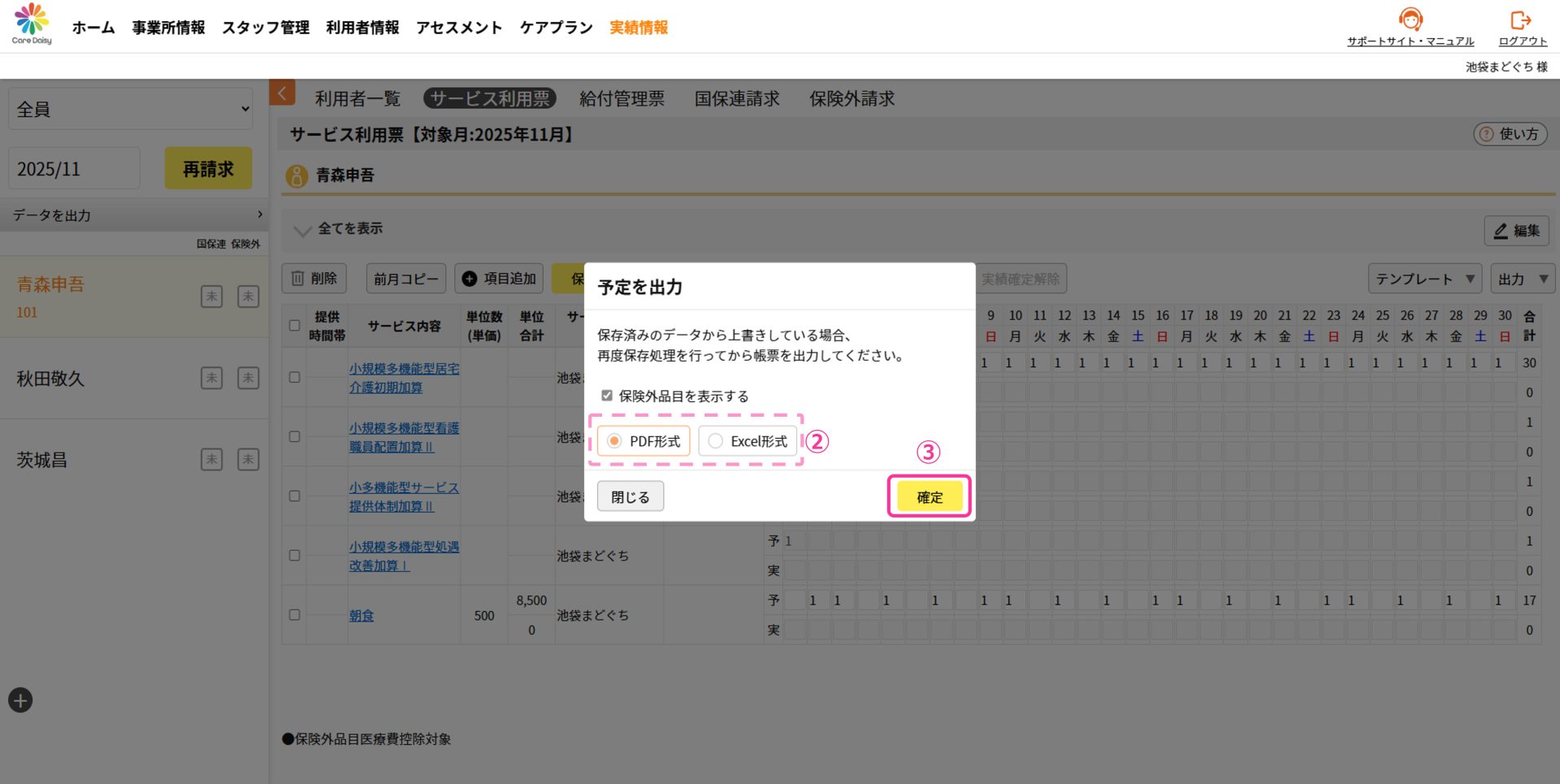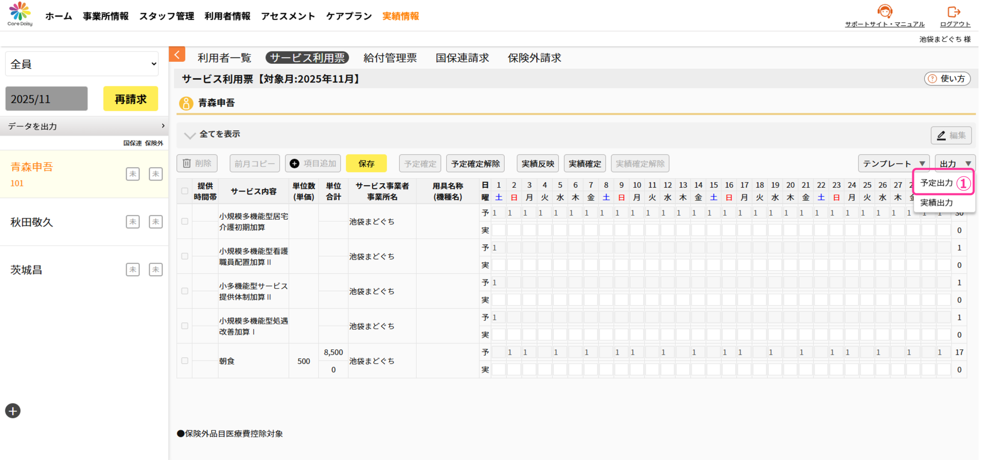 ①サービス利用票を出力したい利用者を選択した状態で、[出力]>[予定出力]をクリックします。