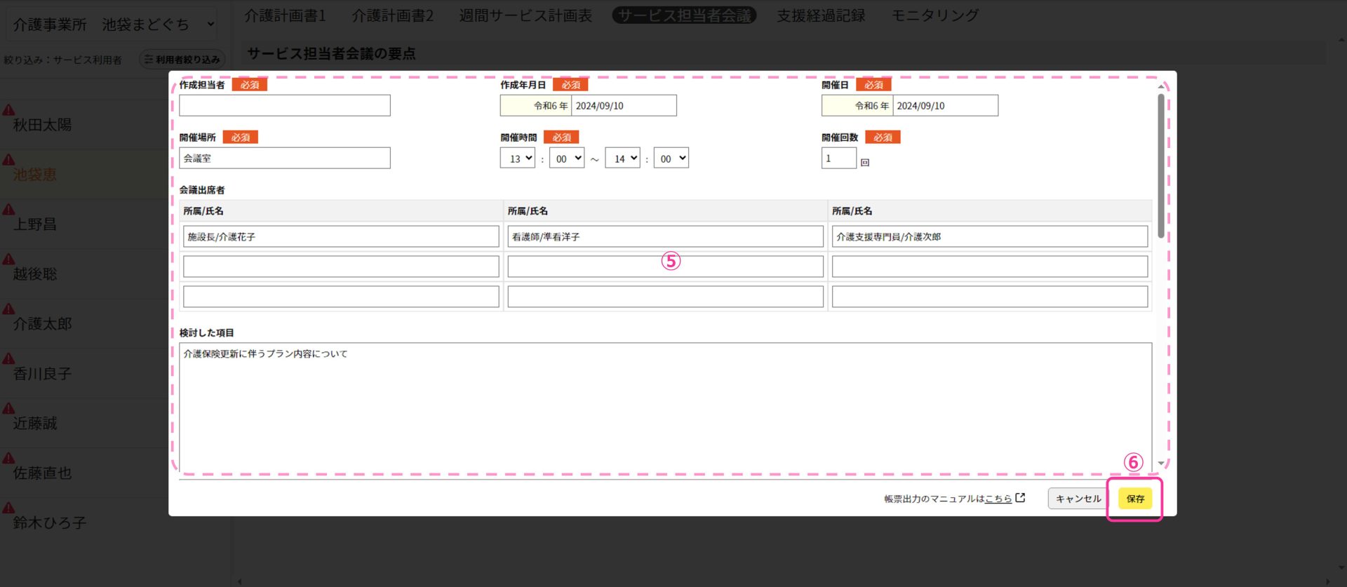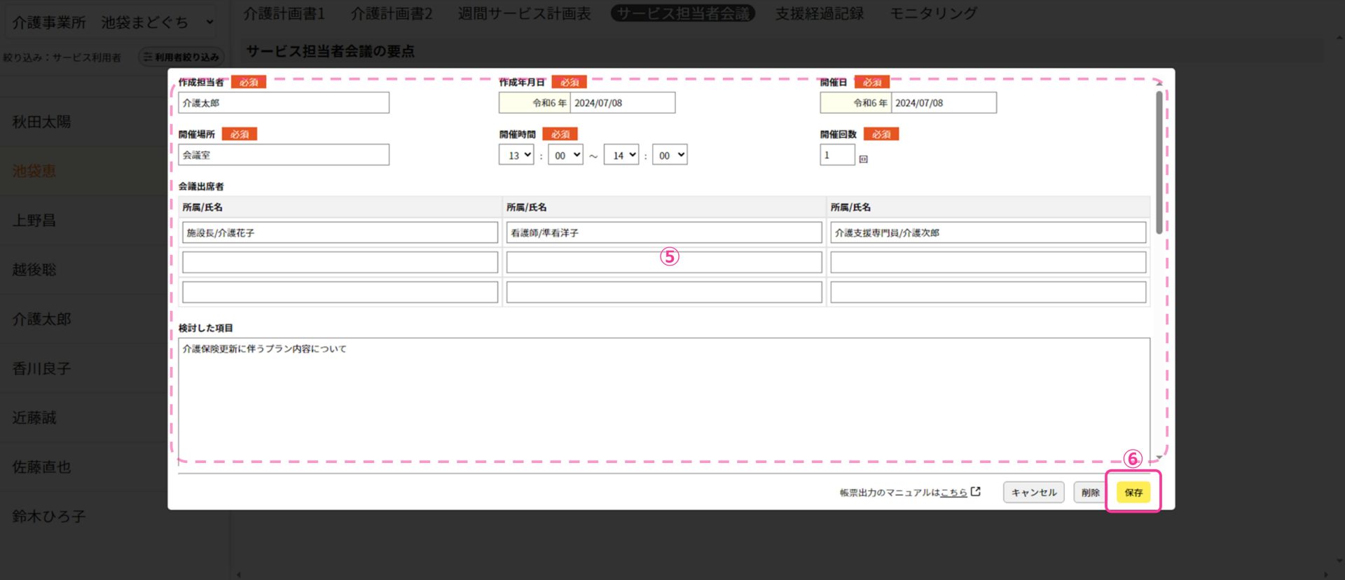 ①「ケアプラン」>「 サービス担当者会議」をクリックして サービス担当者会議の画面を開きます。