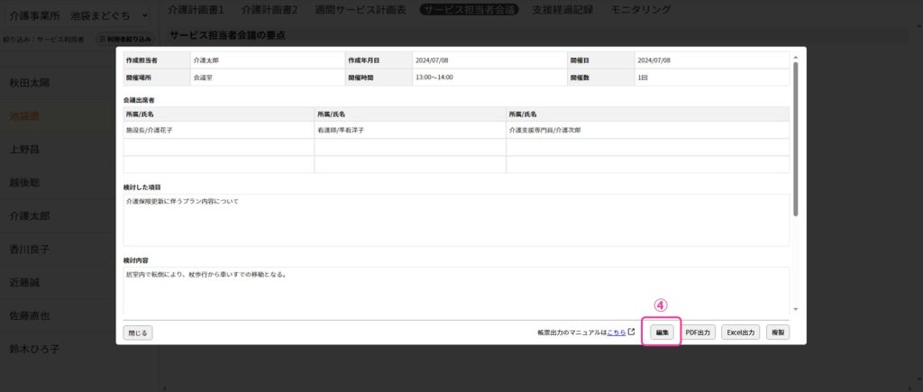 ③編集するサービス担当者会議の[詳細]をクリックします。