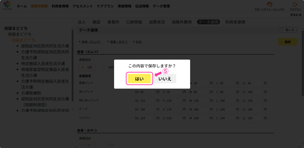 コメットケアとの実績連携で食事・オムツ情報を連携した場合は、必ず保険外費用画面で食事品目(朝食、昼食、夕食、おやつ)またはオムツ品目の自動反映を停止してください