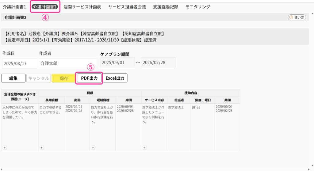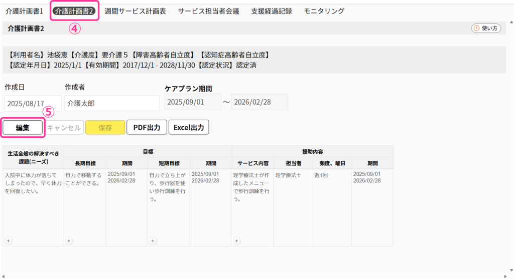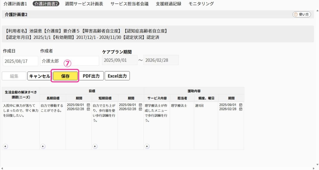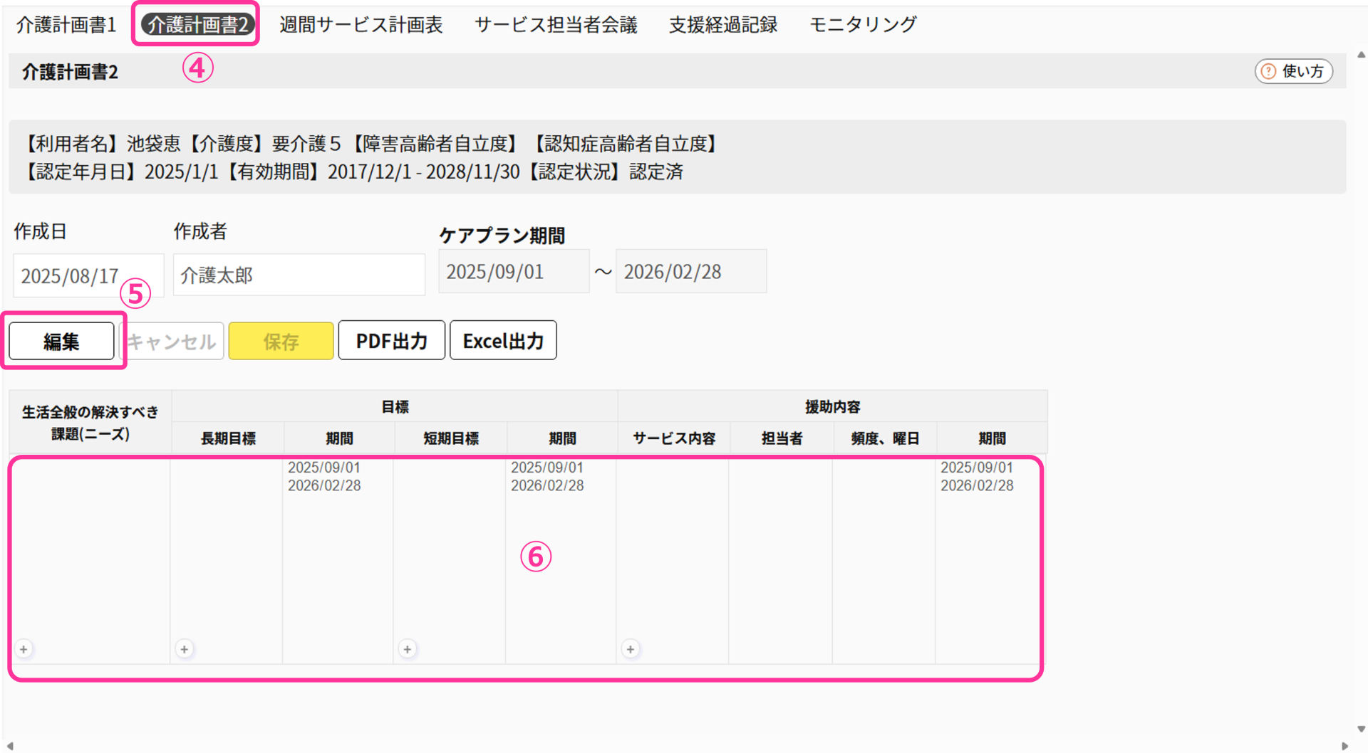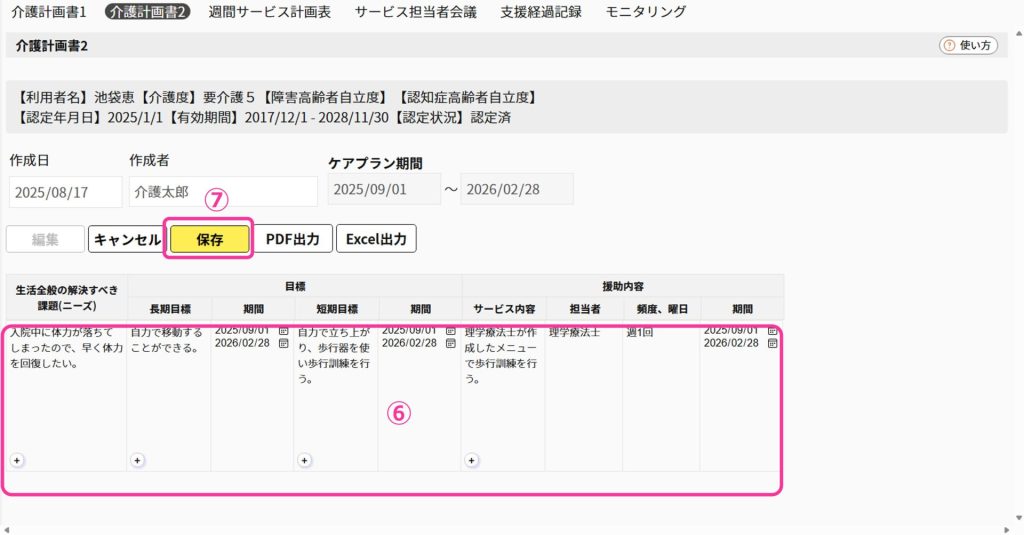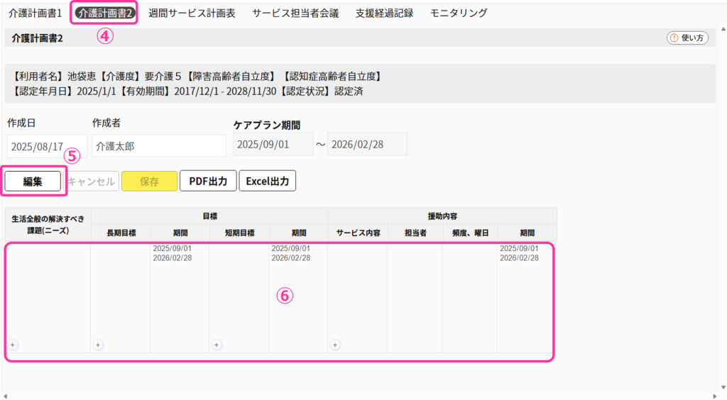 ④「介護計画書2」画面を開きます。このとき、介護計画書1で入力した作成日、作成者、ケアプラン期間が表示されます。