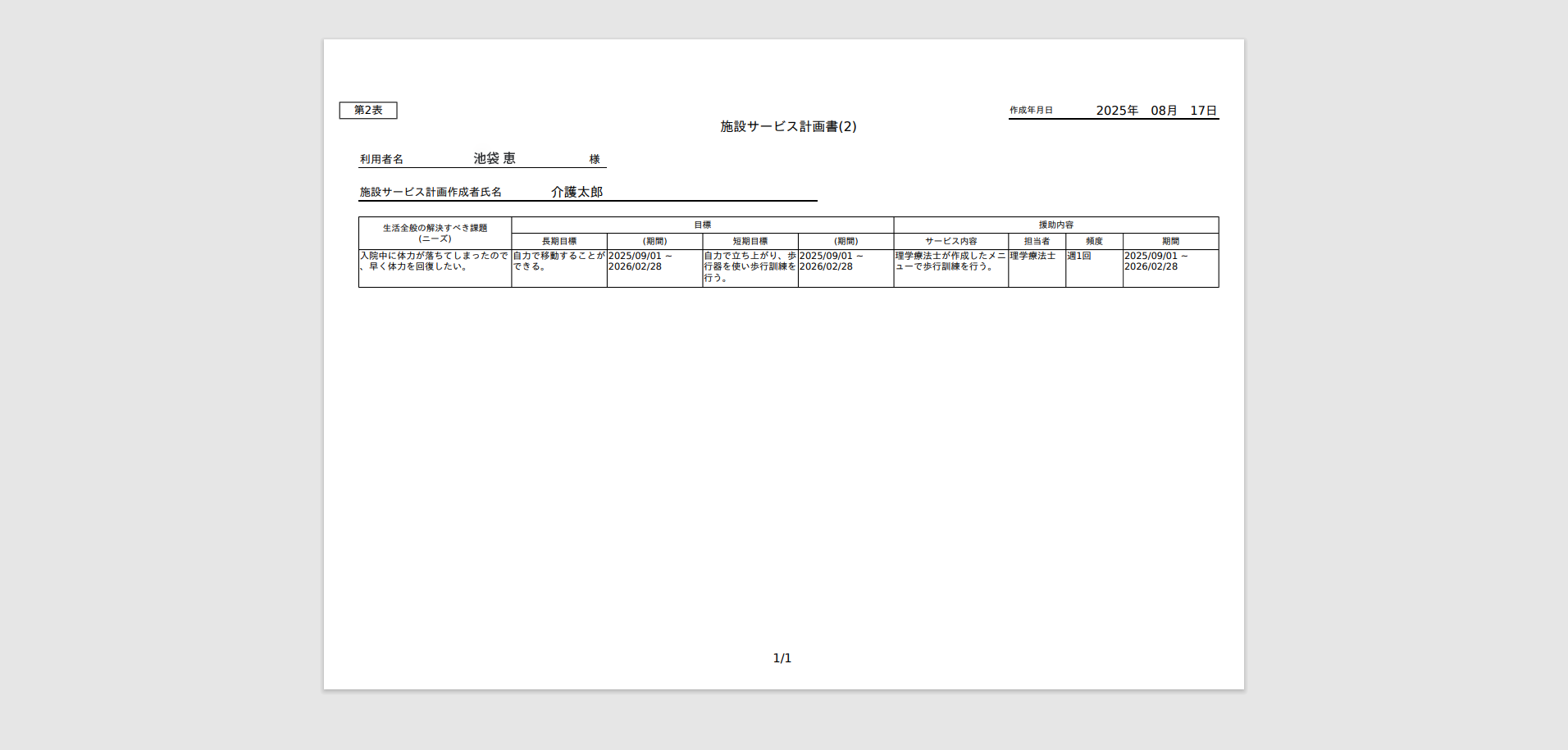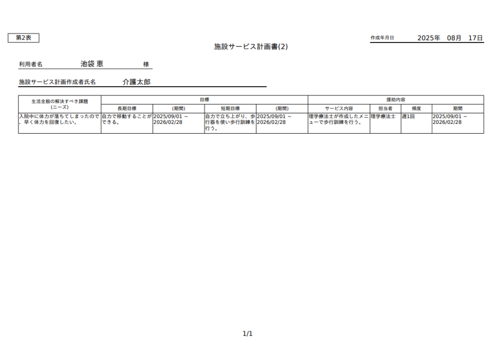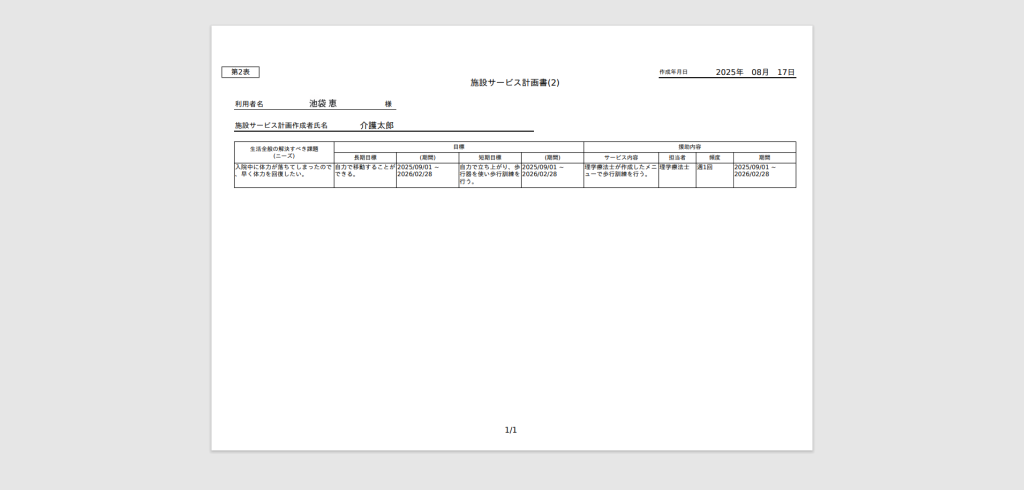 利用者を選択⇒介護計画書1の履歴からケアプランを選択⇒介護計画書2の順で画面を開きます。