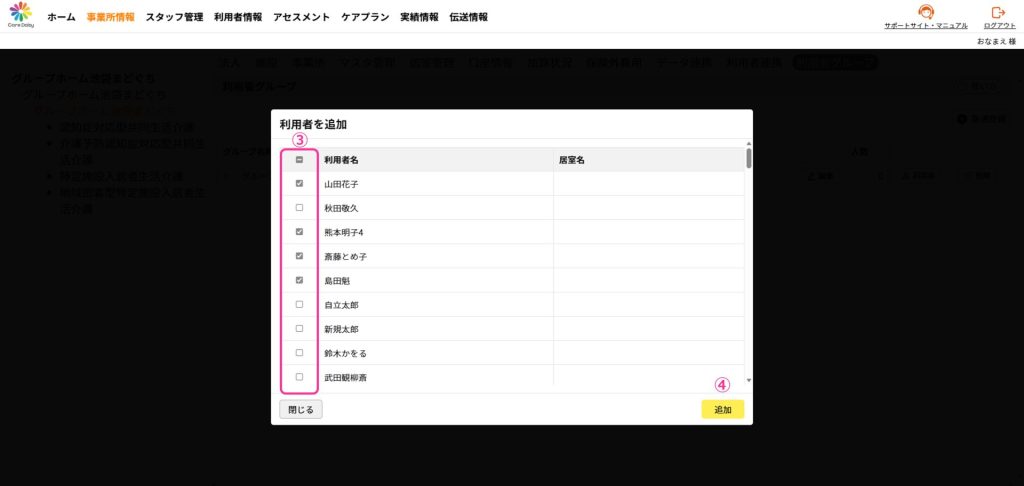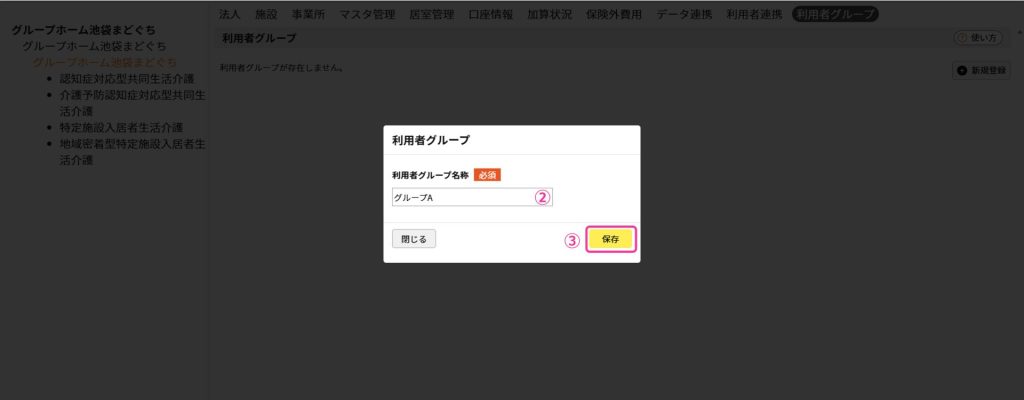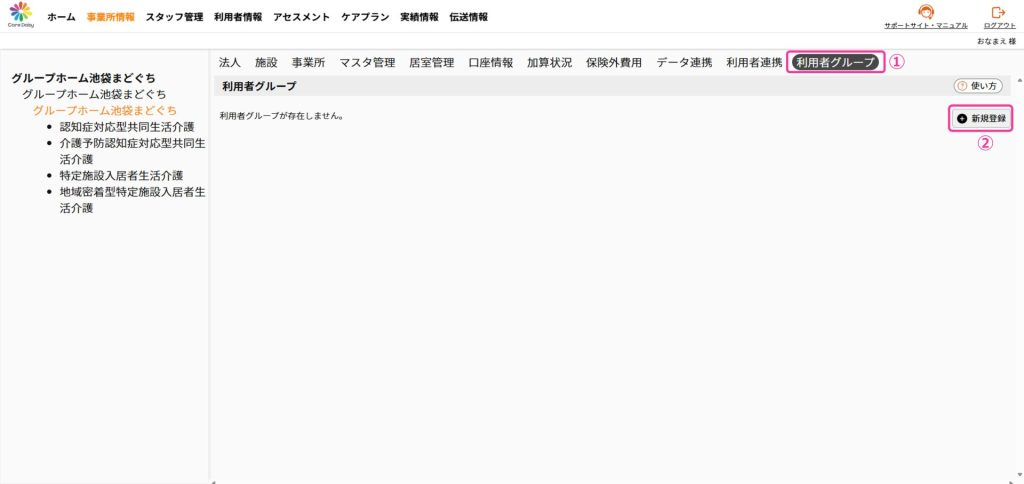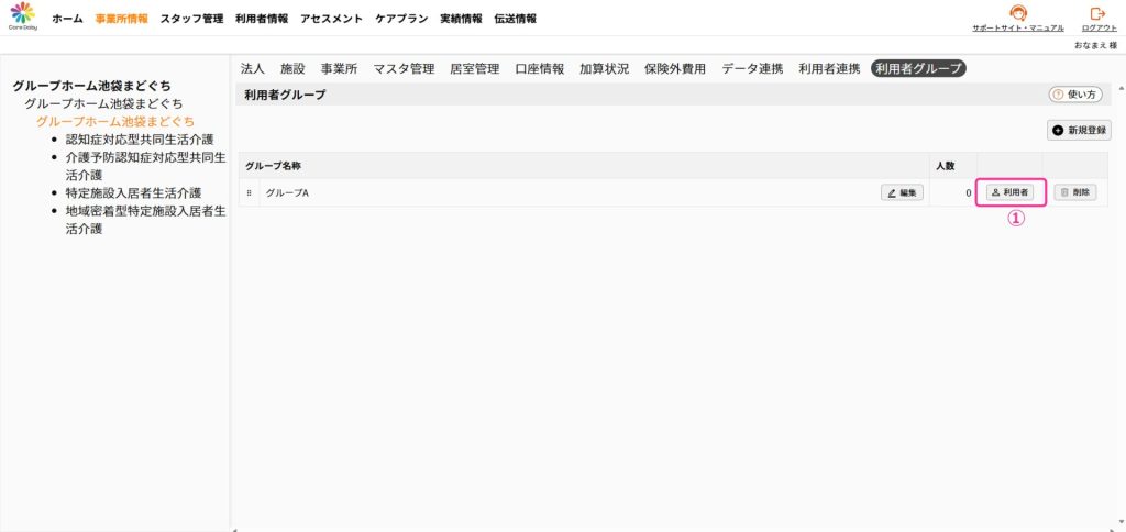 ①事業者情報>利用者グループをクリックして利用者グループ画面を開きます。