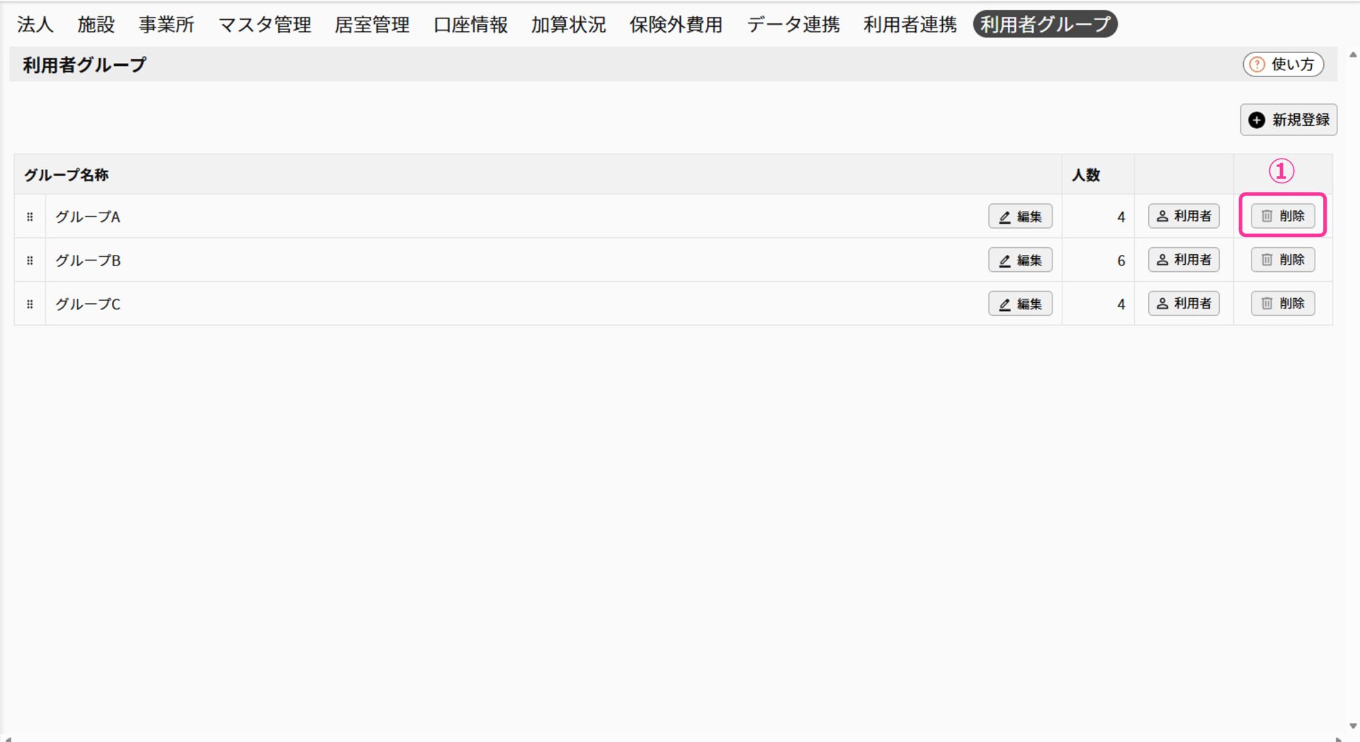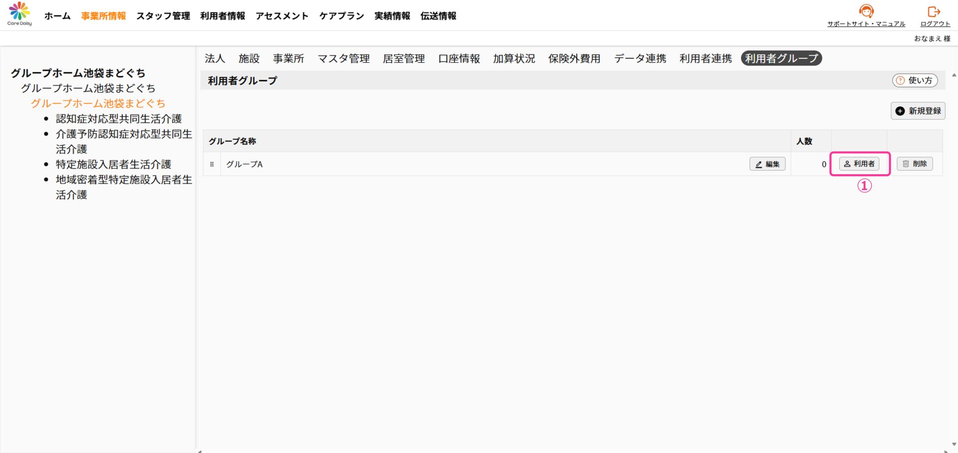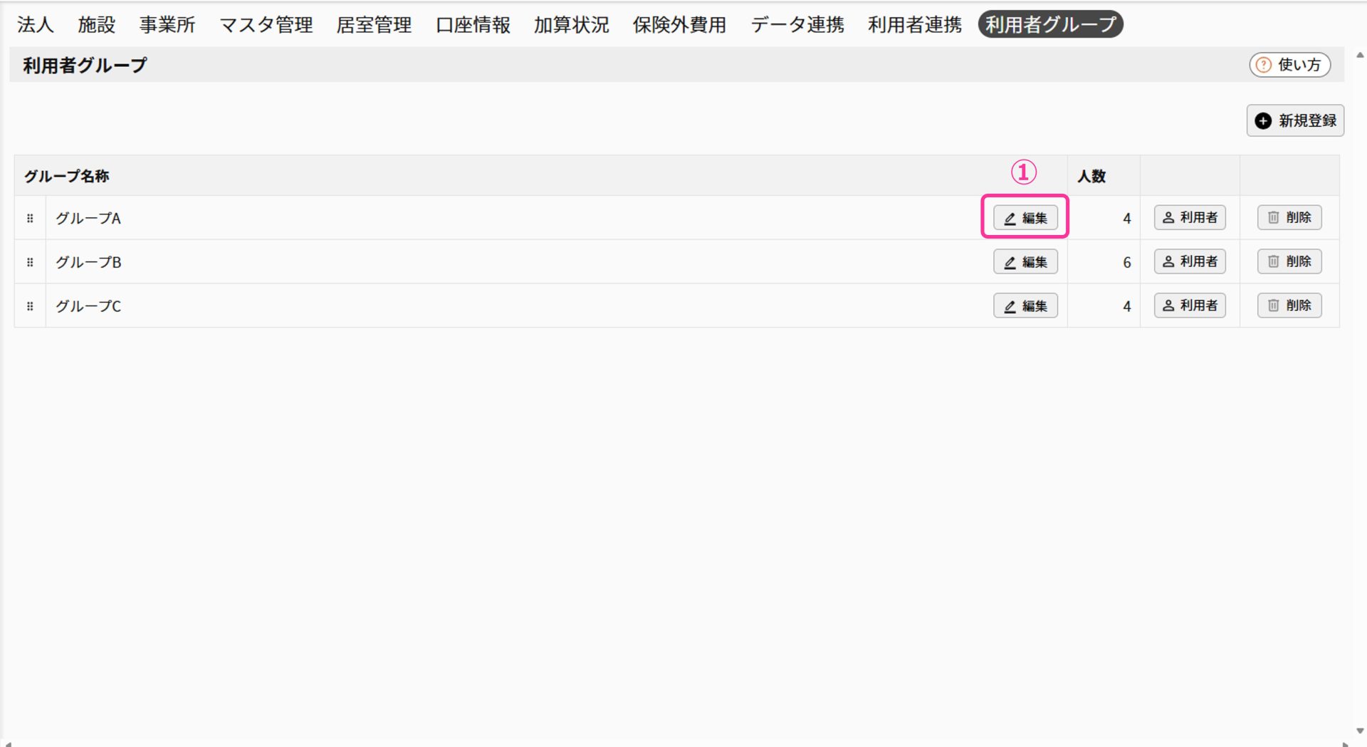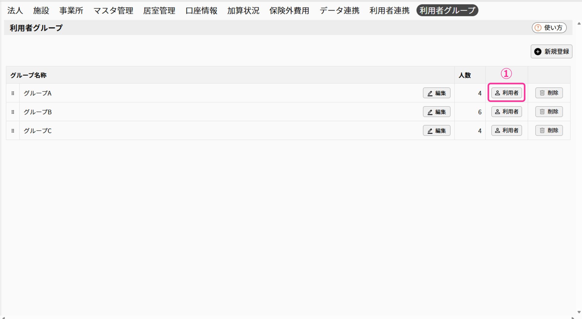 ①事業者情報>利用者グループをクリックして利用者グループ画面を開きます。
