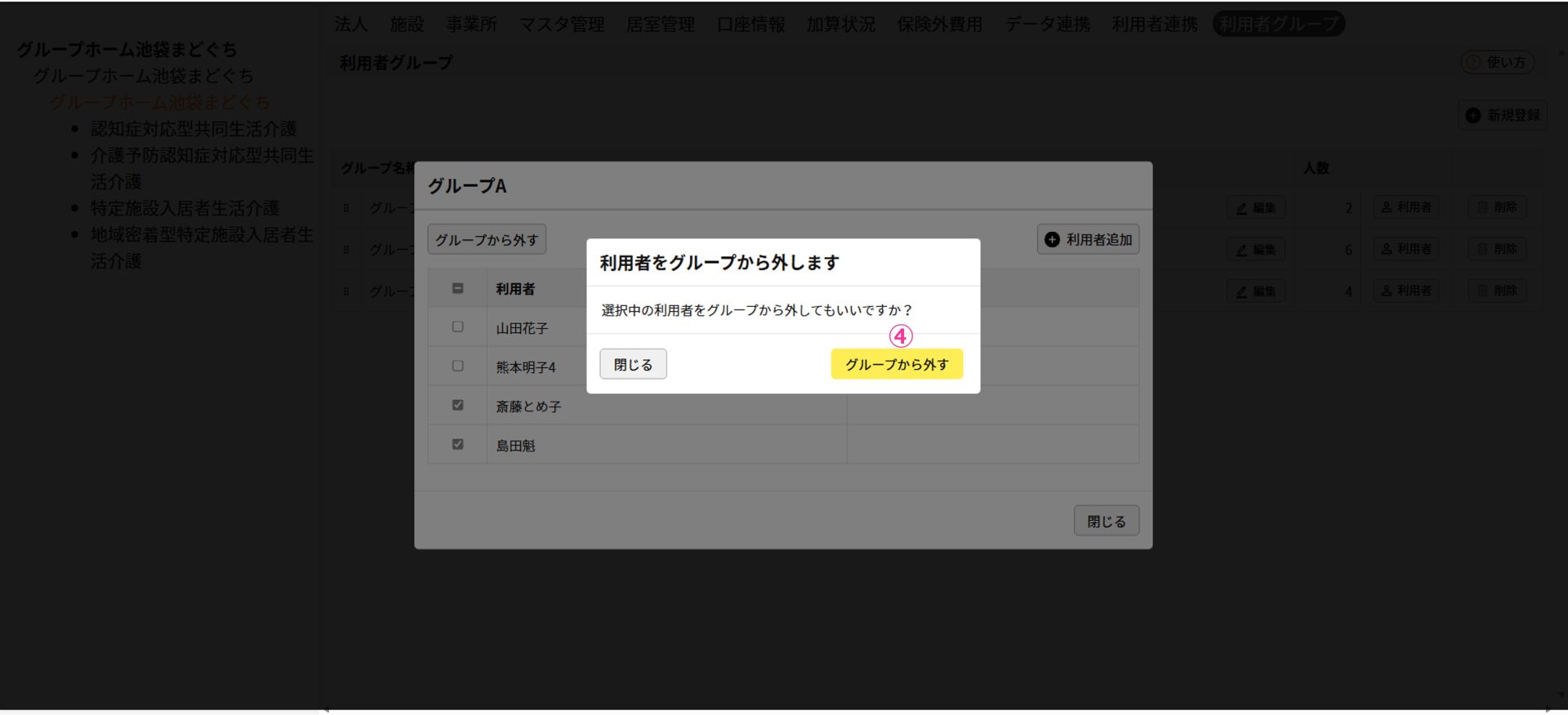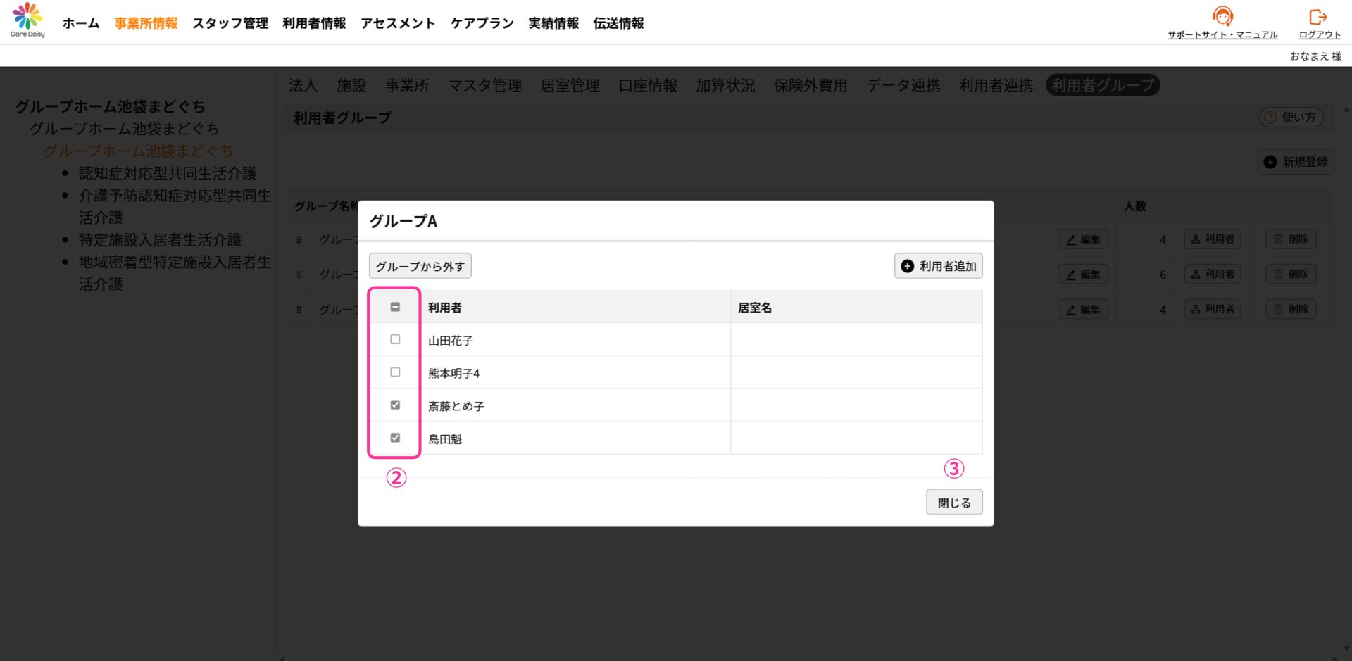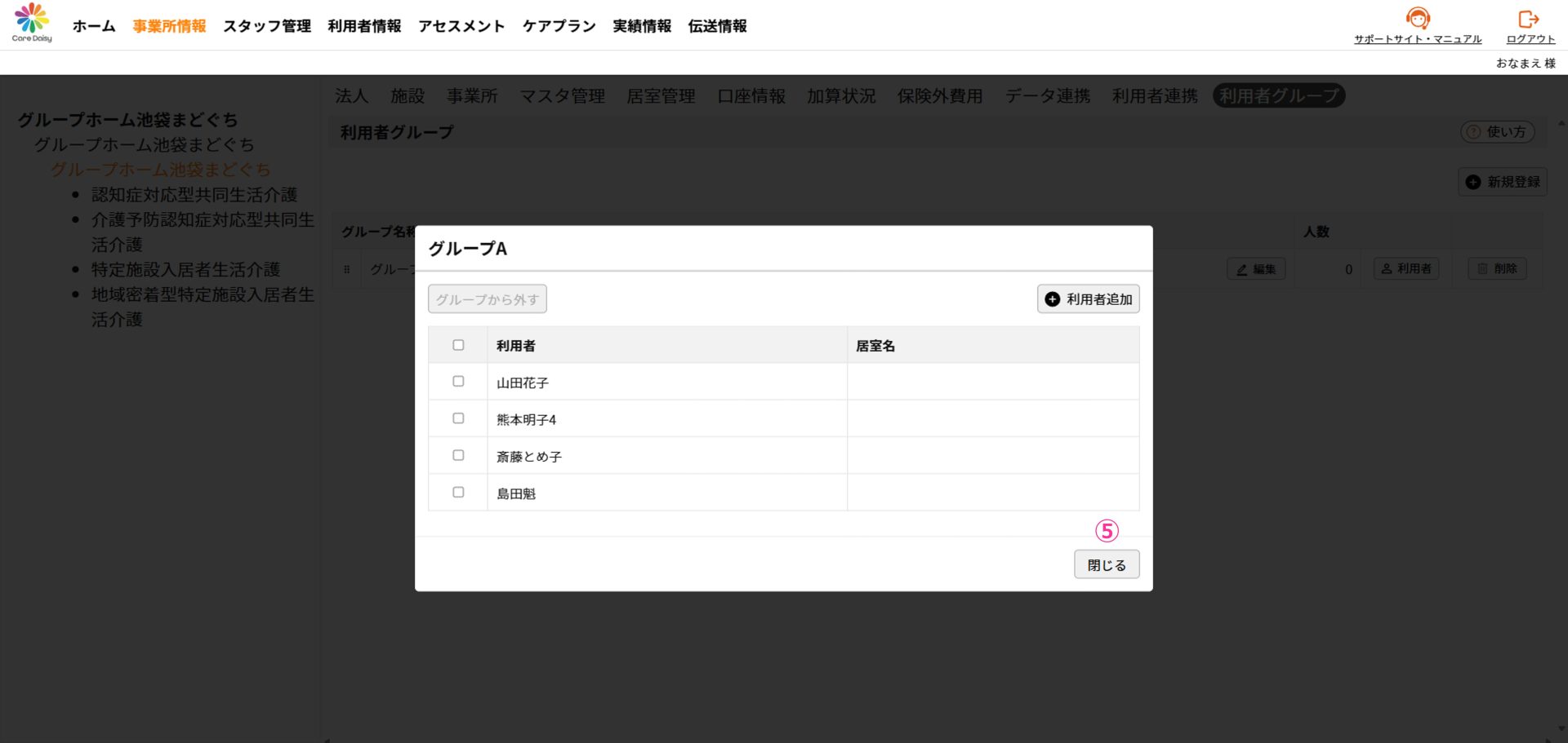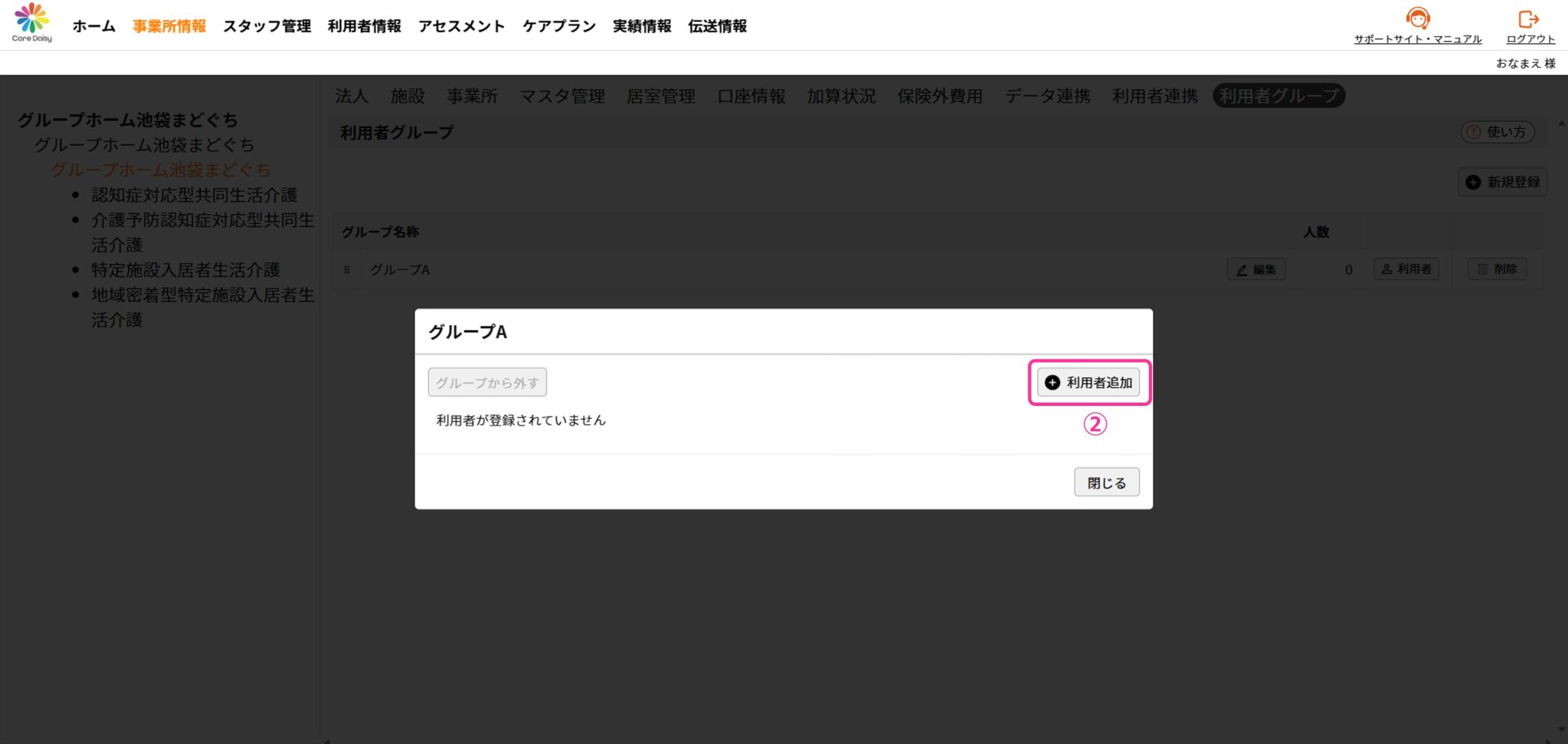 ①事業者情報>利用者グループをクリックして利用者グループ画面を開きます。