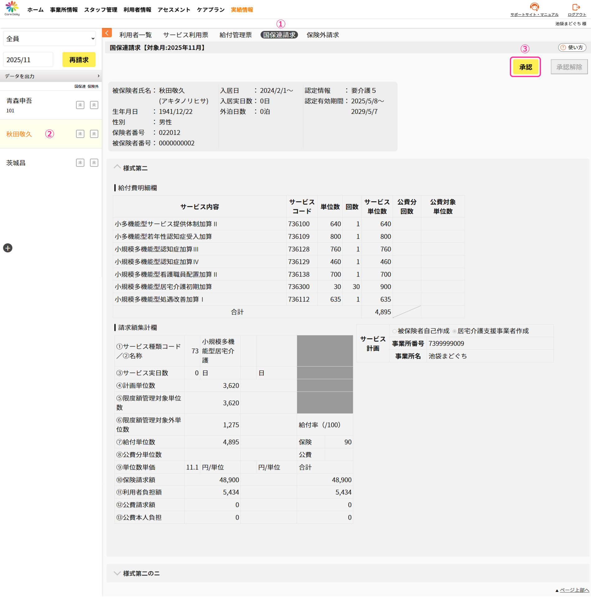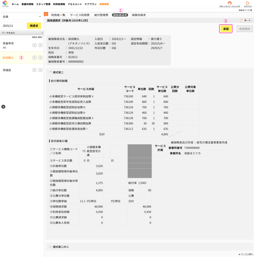 【小規模多機能】国保連請求を承認する 2025.12.23 国保連請求小規模多機能 承認及び承認解除を一括で行う場合はこちらを参考にしてください。 ①「実績情報」>「国保連請求」をクリックして国保連請求画面を開きます。 ②利用者を選択します。 ③内容を確認したら[承認]をクリックします。 承認済みになると利用者一覧の国保連の承認状況が「未」→「承」に変わります。 ⑥[データ出力]から必要な帳票を出力します。 承認を取り消す場合 承認を取り消す場合[承認解除]ボタンをクリックします。