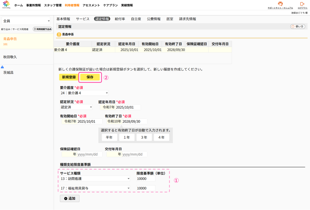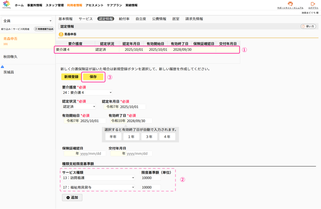 この時点で要介護度、認定状況、認定年月日、有効開始日、有効終了日を入力している状態になっているものとして説明しています。