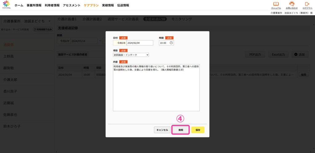 ①「ケアプラン」>「支援経過記録」をクリックして支援経過記録の画面を開きます。
