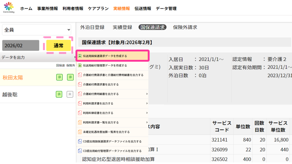 「実績情報|国保連請求」画面で月遅れ、返戻、過誤請求の対応をおこなってから伝送してください。