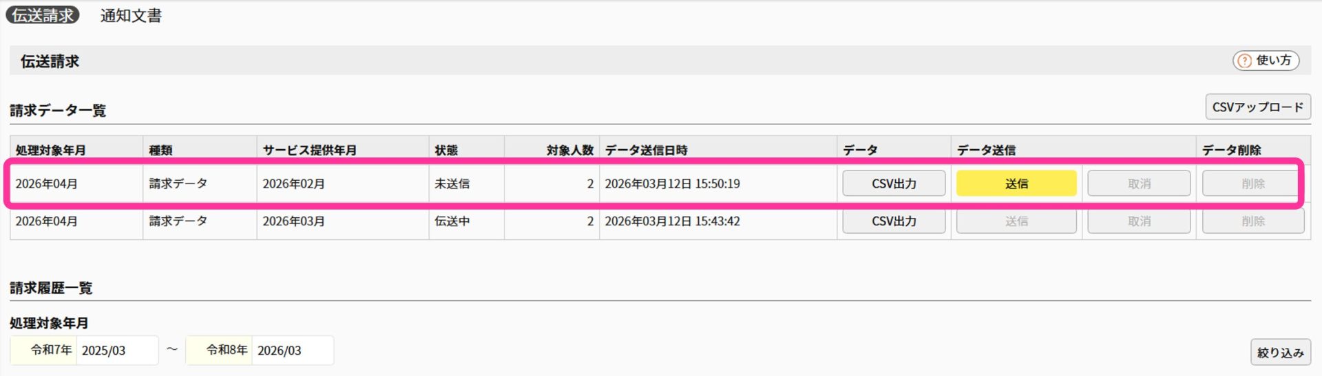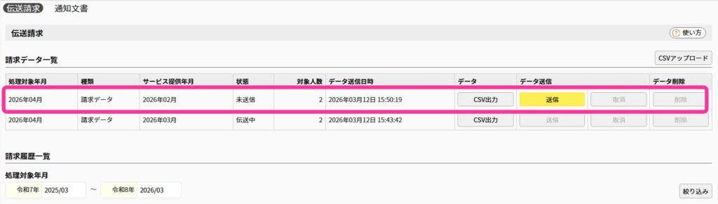 ②内容を確認し、伝送請求受付期間中に送信して下さい。
