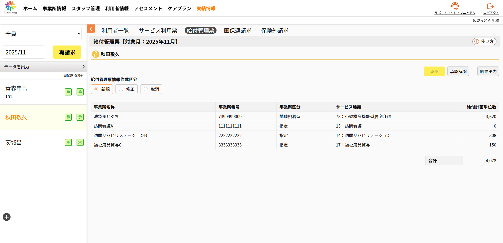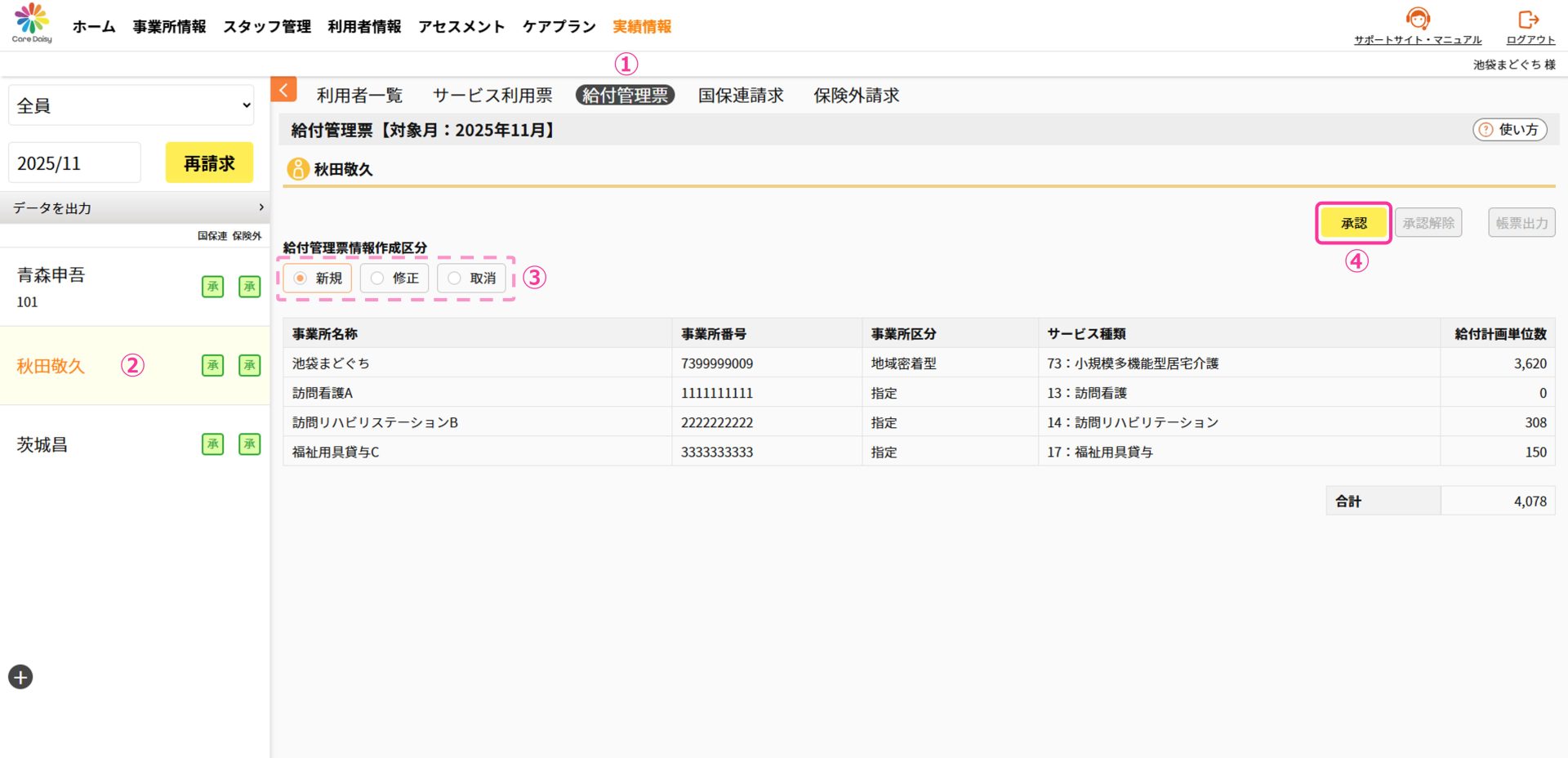 給付管理票を承認する 2025.12.23 給付管理票小規模多機能 ①「実績情報」>「給付管理票」をクリックして給付管理票画面を開きます。 ②利用者を選択します。 ③給付管理票情報作成区分を選択します。 ④内容を確認後[承認]をクリックして承認を行ってください。 承認後の画面表示に変わります。 承認を取り消す場合 承認を取り消す場合[承認解除]ボタンをクリックします。