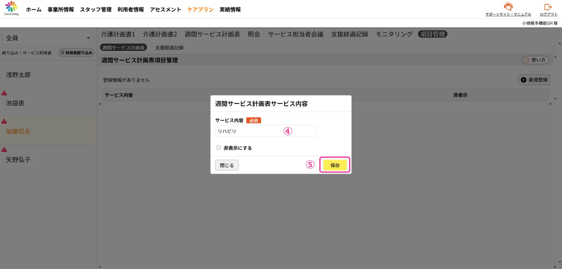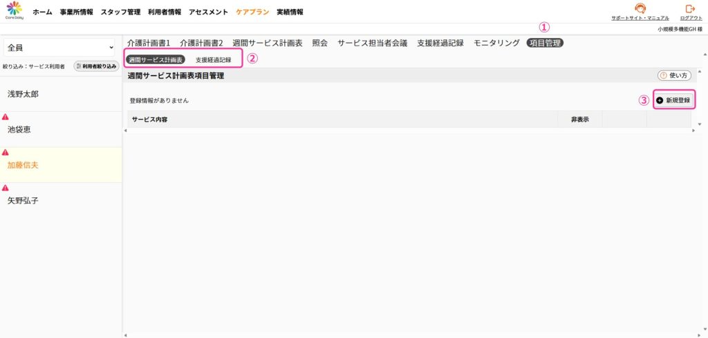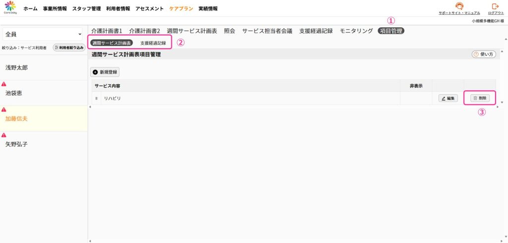 項目管理では「週間サービス計画表」と「支援経過記録」の項目の選択リストに項目を追加したり、リストから非表示にすることができます。