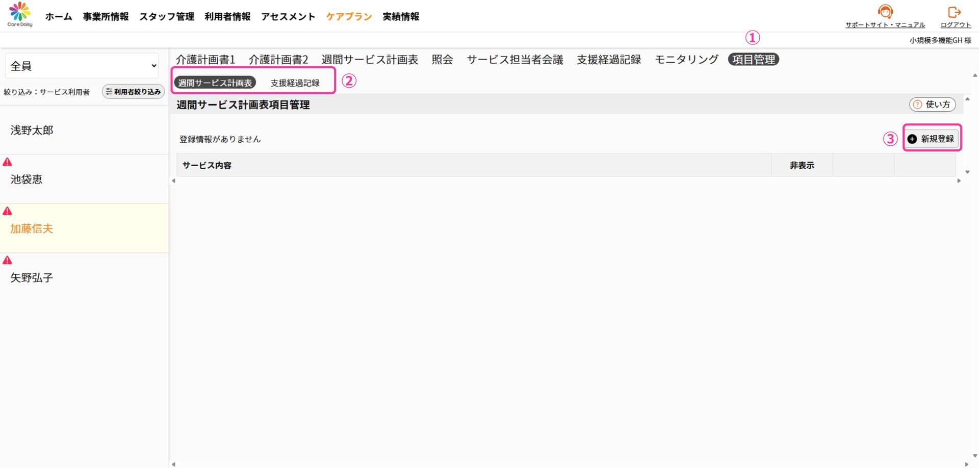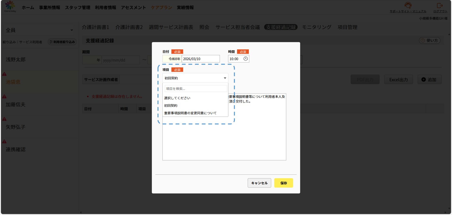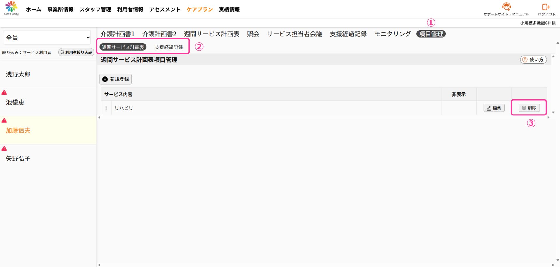 「週間サービス計画表」「支援経過記録」どちらも同じ操作です。