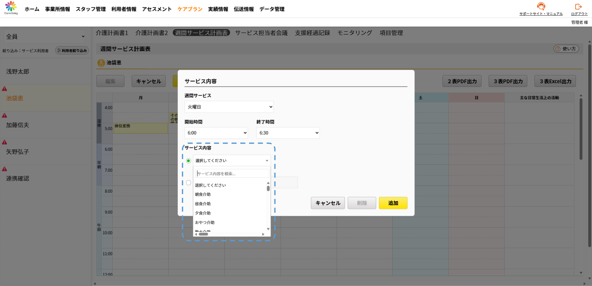 ▽「週間サービス計画表」で登録した項目は「週間サービス計画表」画面のサービス内容の選択リストに表示されます。